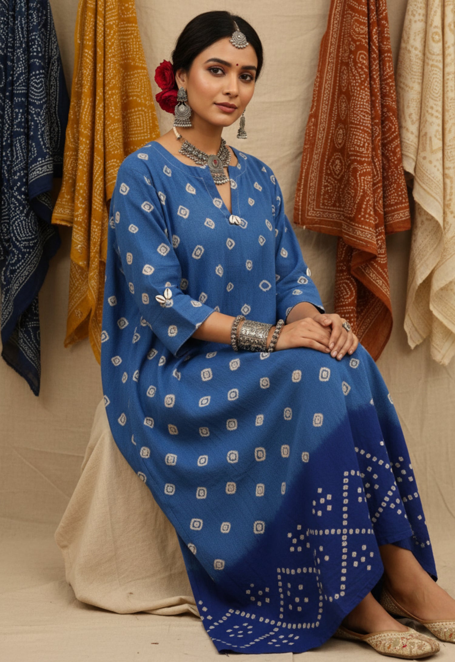 Blue Handcrafted Bandhani Oversized Kurta in Handspun & Handwoven Organic Cotton
